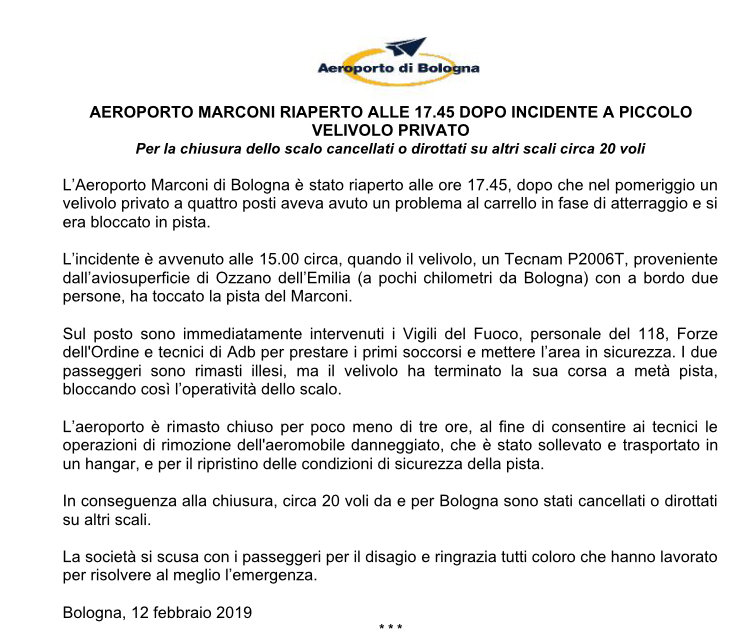 Ha riaperto alle 17:45 lo scalo di Bologna dopo che e’ rimasto chiuso per quasi tre ore a causa di un velivolo bimotore atterrato senza carrello.