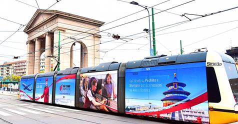 Air China a Milano ha tappezzato questo tram. La pubblicità è da sempre convincente e quindi si usa quello che probabilmente appare molto di più- il tram gira per la città e fa leggere molte persone a costo zero curiose di vedere quel che di coloratissimo che gli da un messaggio.
