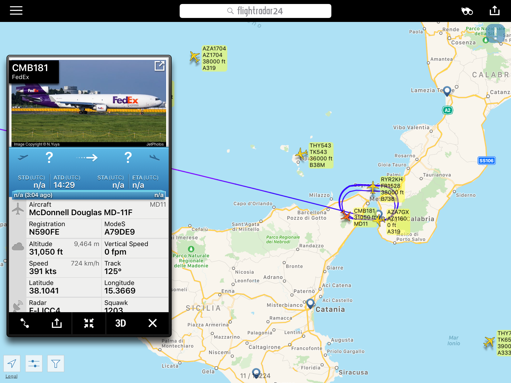 Questo MD11F che vola come CMB181 sta attendendo in holding a FL310 su Reggio Calabria perché Sigonella e’ stato chiuso come Catania per le ceneri vulcaniche eruttate dall’Etna.