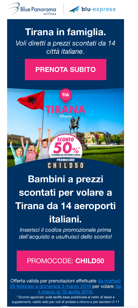 compagnie aeree, vola e paga poco Blue Panorama : promo del 50% di sconto per i bambini sull’Albania Pubblicato da Italiavola il 27 febbraio 2019 I bambini tra i 2 e gli 11 anni avranno uno sconto del 50% sulla tariffa, escluso tasse e supplementi per i voli sull’Albania di Blue Panorama. Valida per voli tra il 4/3 ed il 15/4, acquistabile fino a domenica 3/3. Il codice e’ CHILD50. Condividi: Fai clic per condividere su Facebook (Si apre in una nuova finestra) Facebook Fai clic qui per condividere su LinkedIn (Si apre in una nuova finestra) LinkedIn Fai clic qui per condividere su Reddit (Si apre in una nuova finestra) Reddit Fai clic qui per condividere su Pinterest (Si apre in una nuova finestra) Pinterest Fai clic qui per condividere su Tumblr (Si apre in una nuova finestra) Tumblr Fai clic per condividere su X (Si apre in una nuova finestra) X Mi piace Caricamento... Correlati
