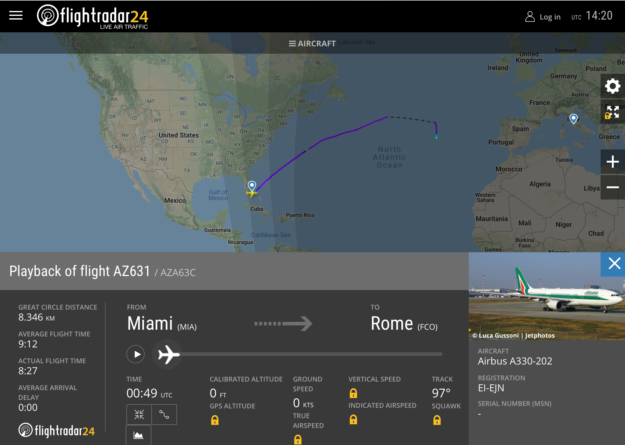 Nella nottata tra martedì e mercoledì il volo AZ631 operato da A330/200 EI-EJN in volo tra Miami e Roma FCO e’ stato forzato ad una diversione fuori programma a Lajes alle Azzorre. L’aereo ha invertito la rotta alle 06:43UTC ed e’ atterrato dopo una mezzoretta abbondante. La ripartenza da Lajes per Roma alle 09:26UTC. Quasi sicuramente un emergenza medica ha causato la repentina inversione di rotta.