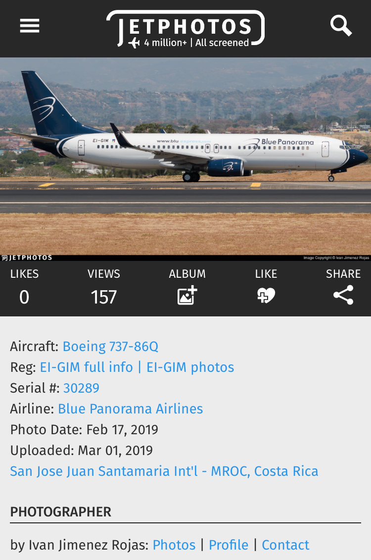 Questo B738/86Q EI-GIM sarebbe il sesto aereo di questo tipo ad entrare nella flotta di Blue Panorama. Precedentemente con Cayman Airways, il velivolo e’ stato fotograto qualche giorno fa a San Jose’ de Costa Rica.