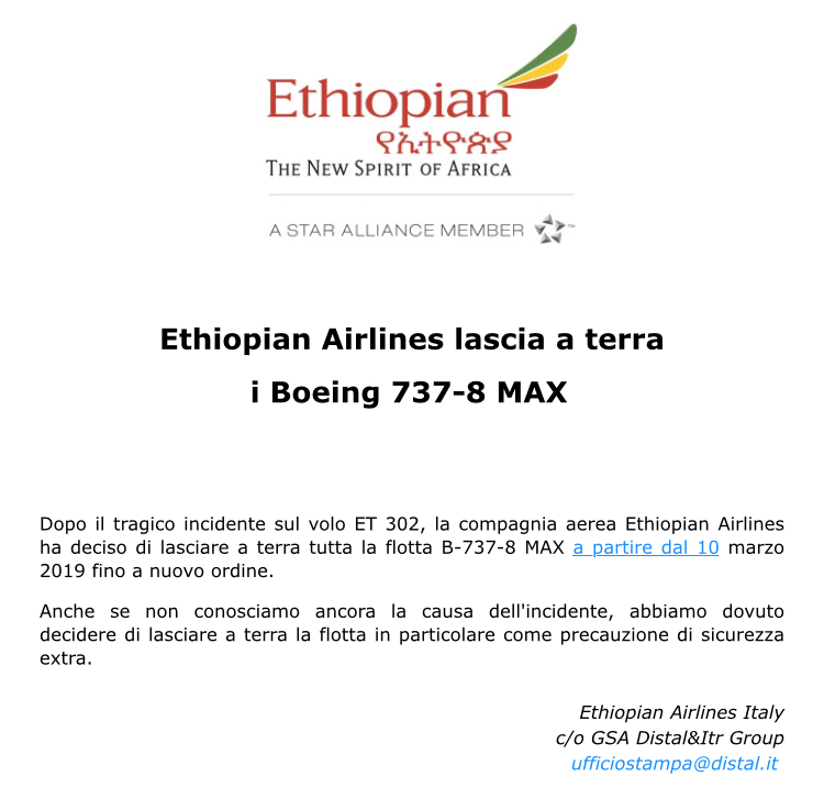 compagnie aeree Ethiopian Airlines mette a terra i B737MAX Pubblicato da Italiavola il 11 marzo 2019 Tutti a terra i B737MAX8 della compagnia aerea etiope. Con la press release nell’immagine il vettore ha deciso la temporanea uscita dal servizio degli aeromobili di questo tipo in flotta. Condividi: Fai clic per condividere su Facebook (Si apre in una nuova finestra) Facebook Fai clic qui per condividere su LinkedIn (Si apre in una nuova finestra) LinkedIn Fai clic qui per condividere su Reddit (Si apre in una nuova finestra) Reddit Fai clic qui per condividere su Pinterest (Si apre in una nuova finestra) Pinterest Fai clic qui per condividere su Tumblr (Si apre in una nuova finestra) Tumblr Fai clic per condividere su X (Si apre in una nuova finestra) X Mi piace Caricamento... Correlati