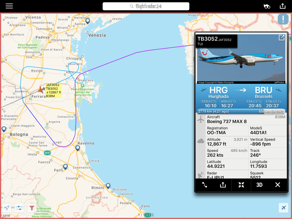 L’aereo Tuifly Belgium con B737MAX 8 atterrerà a Bologna. Il velivolo con matricola OO-TMA che opera il volo TB3052 sta inserendosi per la procedura sulla pista 12, ha lasciato la quota di FL150 che ultimamente aveva in attesa dell’aeroporto di destinazione, visto che non potrà raggiungere Bruxelles.