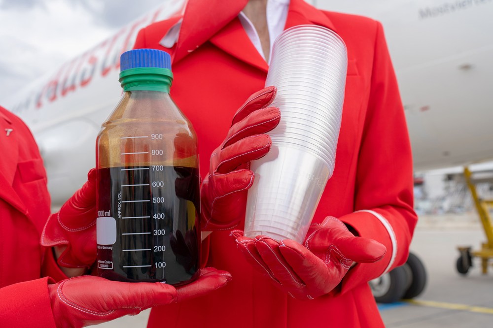 The cooperation with OMV on the ReOil® project can be traced back to the initiative of the Austrian Airlines team from “Fly greener”. “Fly greener” is a project spanning the entire Lufthansa Group. Its goal is to reduce waste volumes and mitigate the environmental impact while optimizing the requisite processes on aircraft. Every Lufthansa Group airline is developing its own ideas and concepts to this end. Several years have already passed since Austrian Airlines started to sort various materials on board and send them for recycling. This involves PET bottles, glass bottles, tetra packs, cans, paper and newspapers. Various projects are currently underway to make air travel more efficient and more environmentally friendly across the group.
