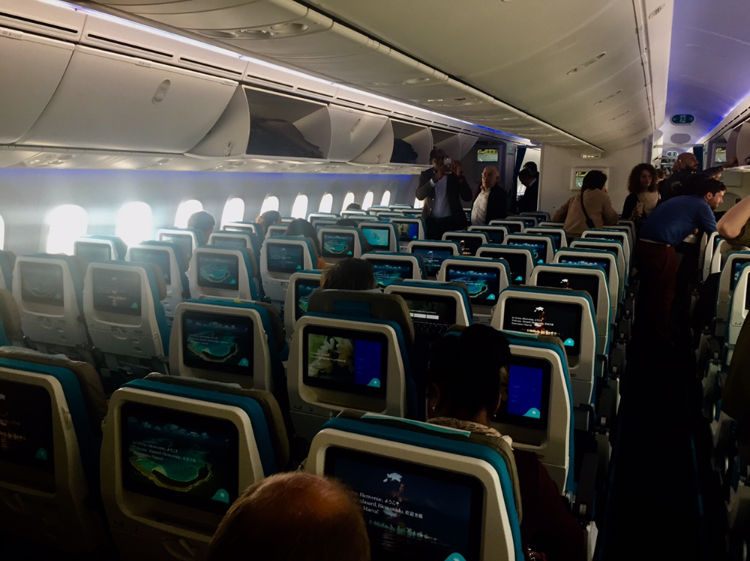 L’avanzamento tecnologico si può toccare veramente con mano. Il B787-9 ha una rumorosità abbattuta del 60% rispetto agli altri velivoli. Ha un avionica che previene le turbolenze scoprendole in anticipo. E’ stato migliorato nel sistema di purificazione dell’aria nella cabina di passeggeri. I passeggeri saranno più riposati con l’illuminazione graduata a led che concettualmente e’ nata come una terapia contro lo stress generato dai voli sulle lunghe distanze. Gli oblò sono più grandi e panoramici, oltre ad un sistema di regolazione della luminosità gestita mediante una polarizzazione elettronica. A bordo vi e’ una connettività Wi-Fi ad altissima velocità. Tutti gli schermi sono touch screen ad alta definizione di immagine. Il duty free può essere prenotato su Tahiti-airstore.com direttamente dal posto.