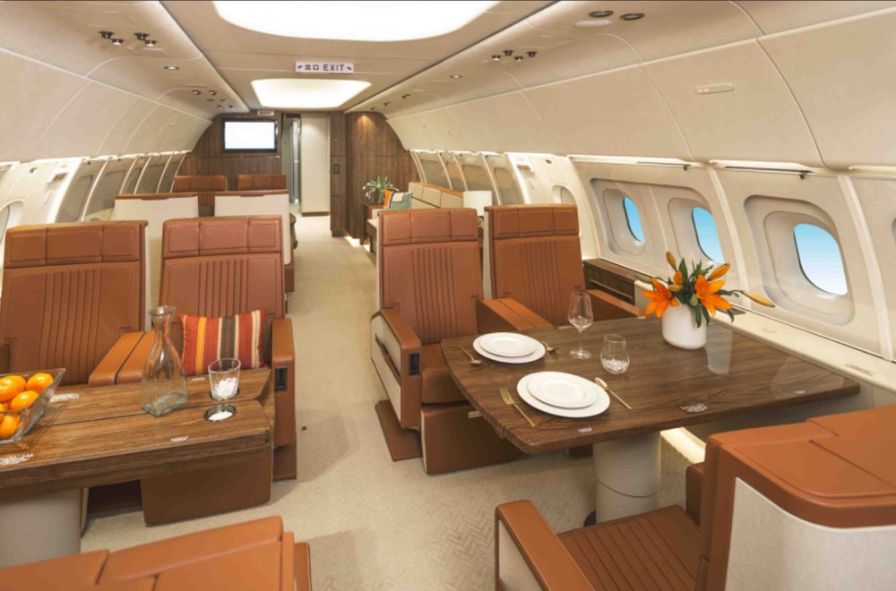 L’aeromobile è dotato di un’elegante cabina progettata da Hermès, due ampi salotti, uno spazio conferenze/sala da pranzo, un ufficio/camera da letto con bagno annesso ed è certificato per 19 passeggeri.