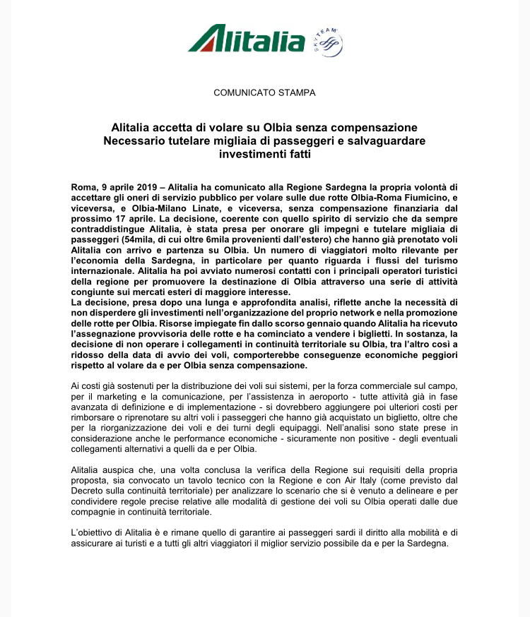 compagnie aeree, rotte Alitalia : opererà senza oneri su Olbia per la tutela degli investimenti Pubblicato da Italiavola il 9 aprile 2019 Ecco il comunicato stampa dove Alitalia comunica le sue intenzioni di procedere ad operare su Olbia senza oneri come si e’ offerta Air Italy. Condividi: Fai clic per condividere su Facebook (Si apre in una nuova finestra) Facebook Fai clic qui per condividere su LinkedIn (Si apre in una nuova finestra) LinkedIn Fai clic qui per condividere su Reddit (Si apre in una nuova finestra) Reddit Fai clic qui per condividere su Pinterest (Si apre in una nuova finestra) Pinterest Fai clic qui per condividere su Tumblr (Si apre in una nuova finestra) Tumblr Fai clic per condividere su X (Si apre in una nuova finestra) X Mi piace Caricamento... Correlati