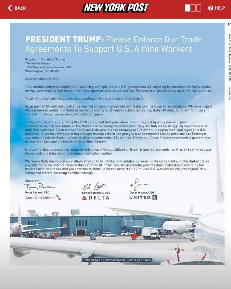 compagnie aeree, rotte Air Italy : le big 3 scrivono a Trump Pubblicato da Italiavola il 18 aprile 2019 Due giorni fa e’ uscita sul New York Post questa lettera congiunta inviata al Presidente Trump e scritta dai leader di American, Delta e United. Condividi: Fai clic per condividere su Facebook (Si apre in una nuova finestra) Facebook Fai clic qui per condividere su LinkedIn (Si apre in una nuova finestra) LinkedIn Fai clic qui per condividere su Reddit (Si apre in una nuova finestra) Reddit Fai clic qui per condividere su Pinterest (Si apre in una nuova finestra) Pinterest Fai clic qui per condividere su Tumblr (Si apre in una nuova finestra) Tumblr Fai clic per condividere su X (Si apre in una nuova finestra) X Mi piace Caricamento... Correlati