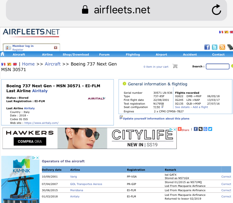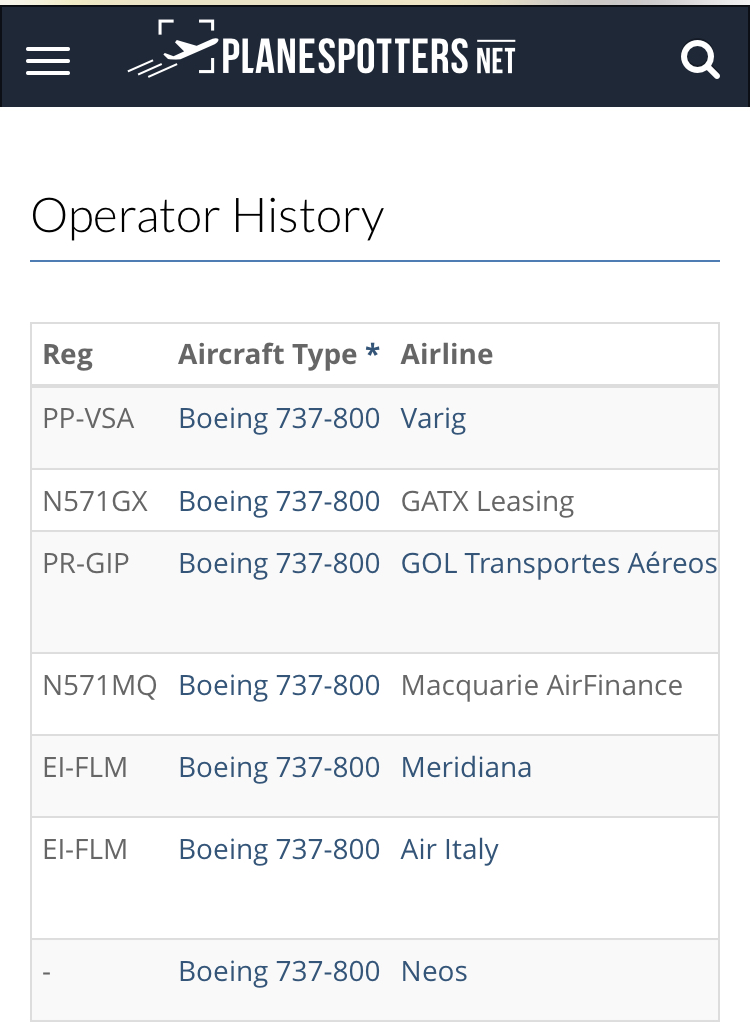 Il fatto ci e’ stato segnalato da un lettore, che ci ha inviato lo screenshot della cronologia di cambio operatori, riguardante il velivolo in questione.