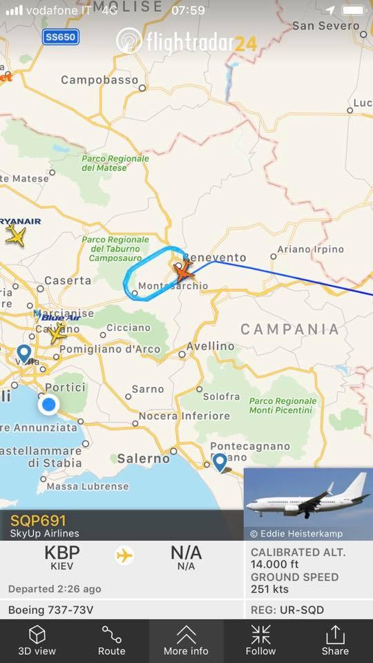 SkyUp ha iniziato i suoi servizi aerei su Napoli. Ecco qui il B737-73V UR-SQD in holding poche decine di minuti fa vicino all’aeroporto di Capidichino.