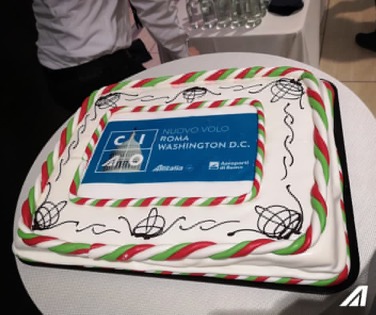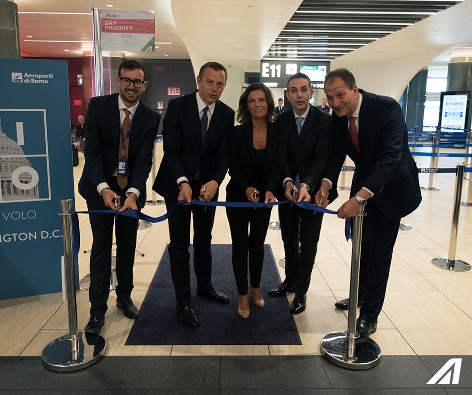 Il primo volo da Roma Fiumicino e Washington Dulles e’ ripartito questa mattina con il taglio del nastro. Marco Gobbi di Aeroporti di Roma e Nicola Bomacchi per Alitalia.