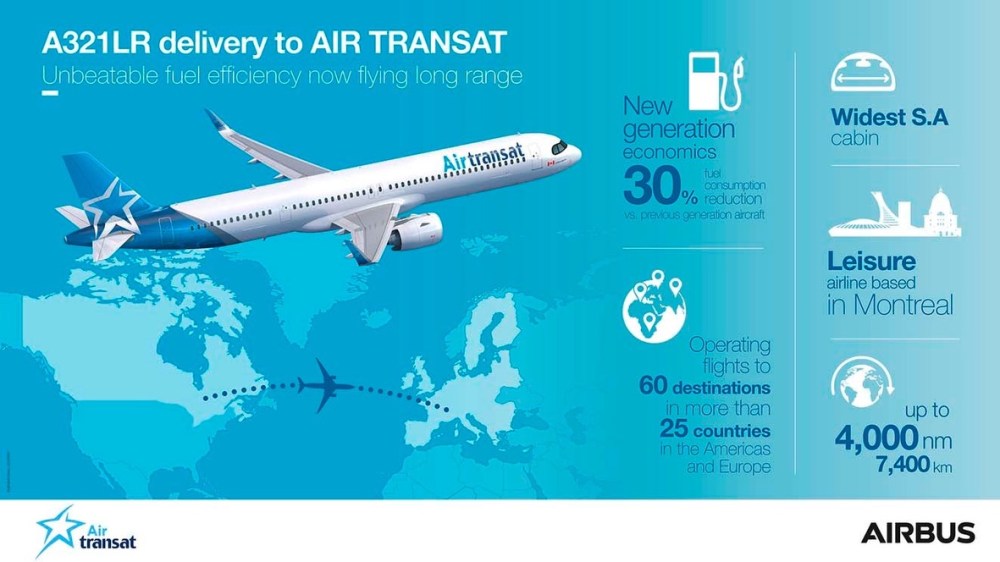 Gli A321LR fanno parte di un più ampio accordo di leasing siglato da Air Transat con AerCap, al fine di convertire tutta la flotta in aeromobili Airbus entro il 2022, sostituendo così abbandonare i propri datati aeromobili widebody e narrow-body.