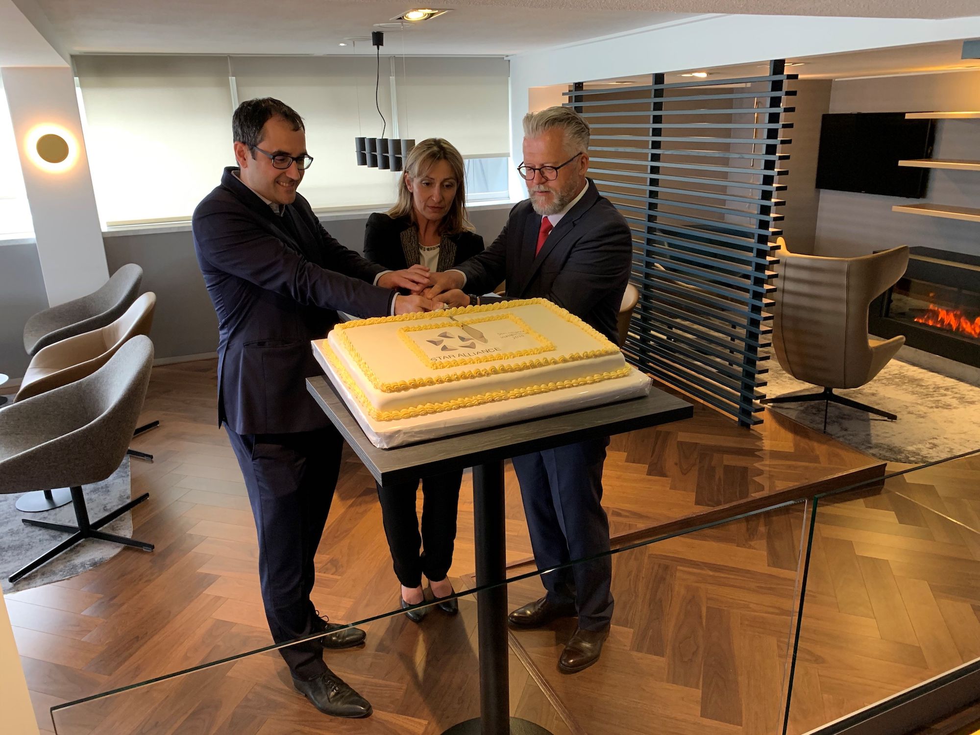 Didascalia Foto (da sinistra a destra): Fabien Lawson, Director Terminal 1, Groupe ADP, Virginie Auriol, Star Alliance France Manager e Christian Dräger, Star Alliance VP Customer Experience festeggiano l’inaugurazione della Lounge Star Alliance rinnovata, durante la cerimonia con il taglio della torta.