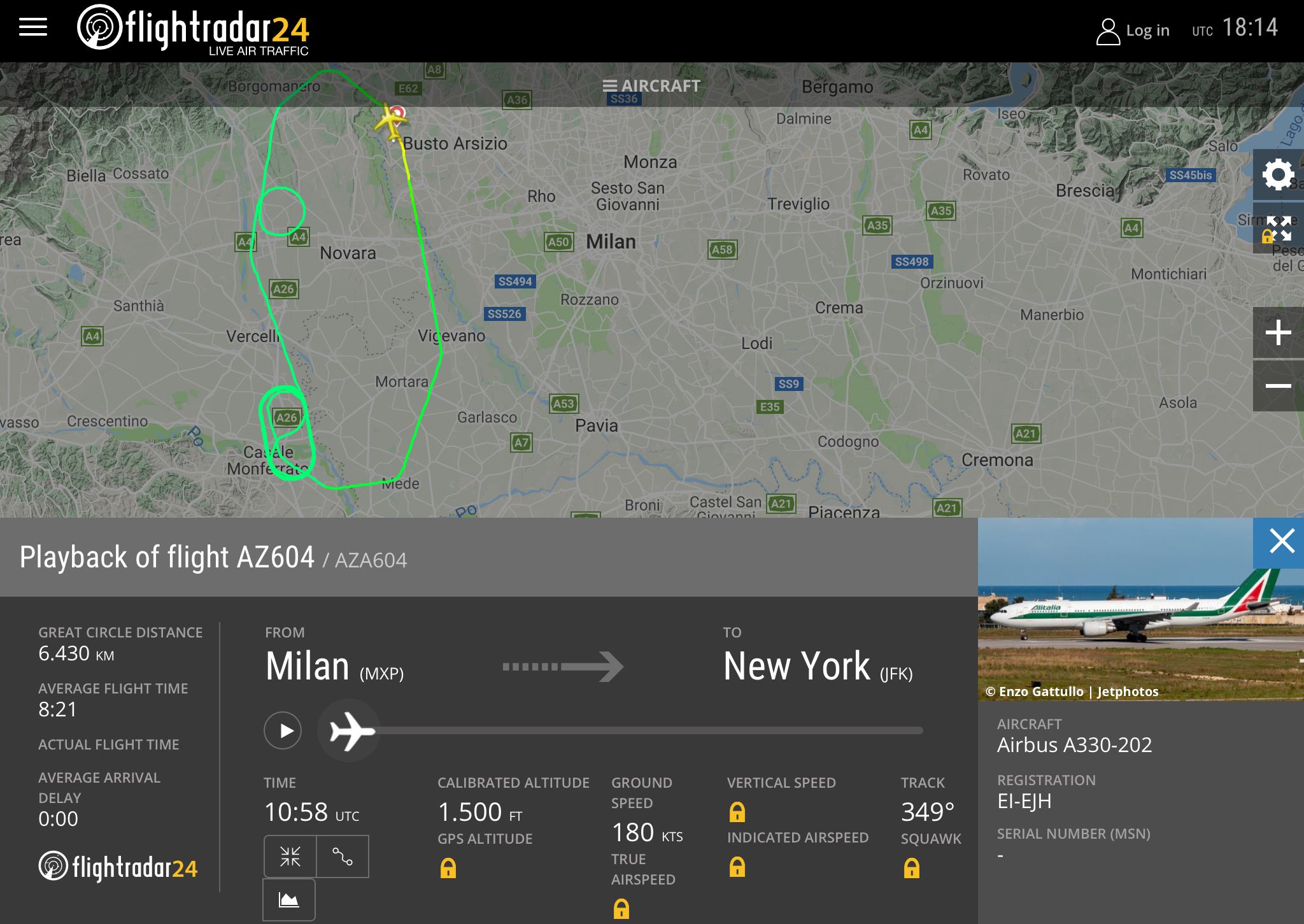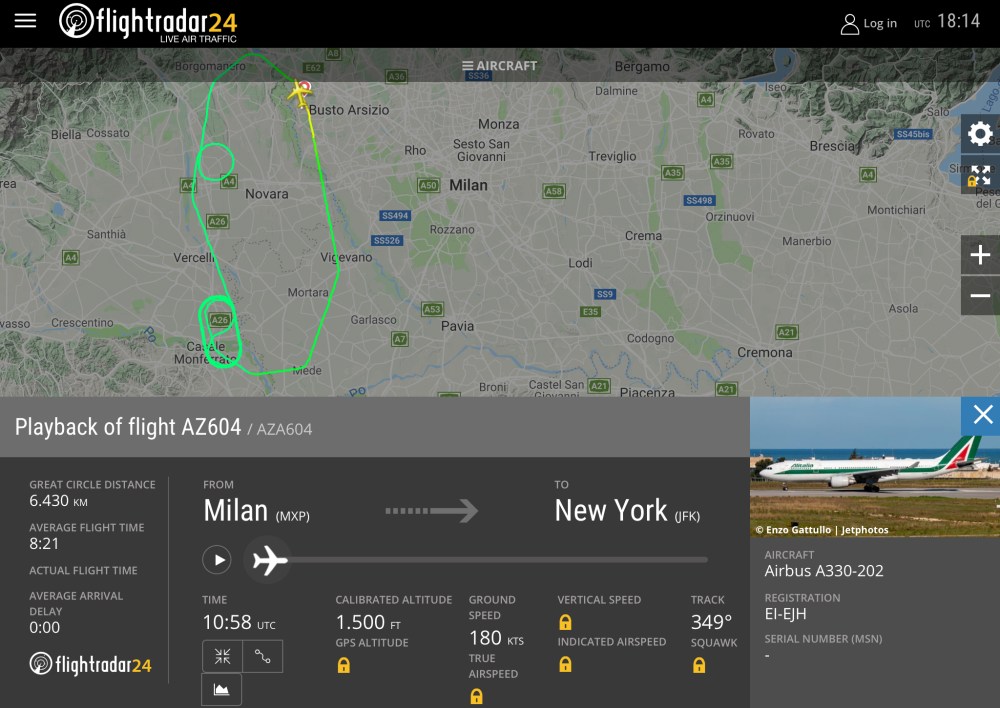 Il volo AZ604 di ieri da Milano Malpensa a New York JFK e’ atterrato nuovamente all’aeroporto di partenza a causa di un inefficienza al carrello. Il velivolo A330-202 Alitalia EI-EJH ha effettuato una decina di Holding a velocità ridotta su Casale Monferrato con carrello rimasto completamente esteso. Successivamente e’ atterrato di nuovo a Milano Malpensa,