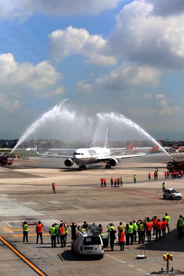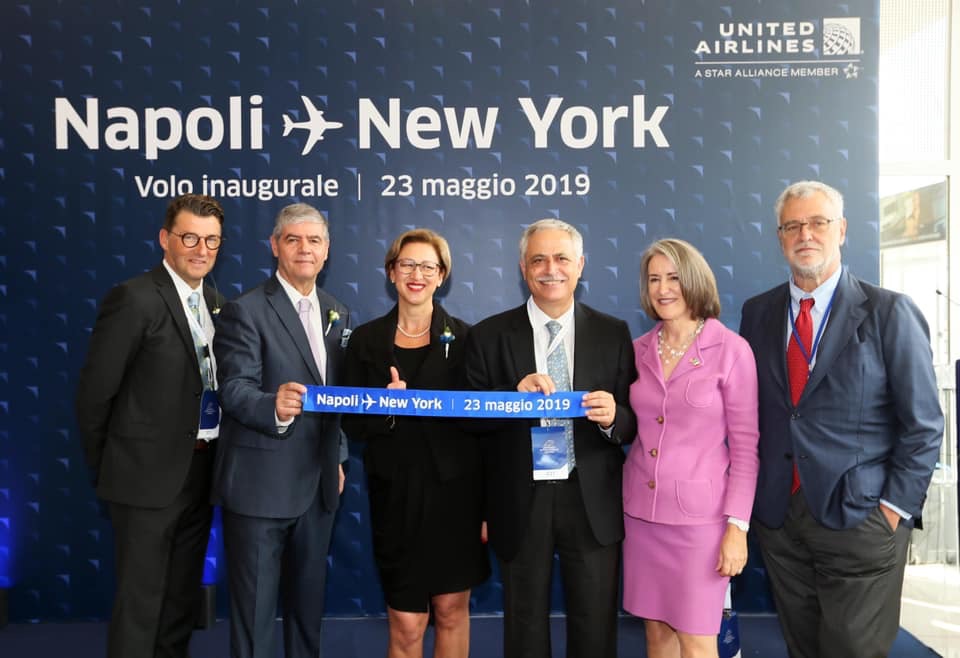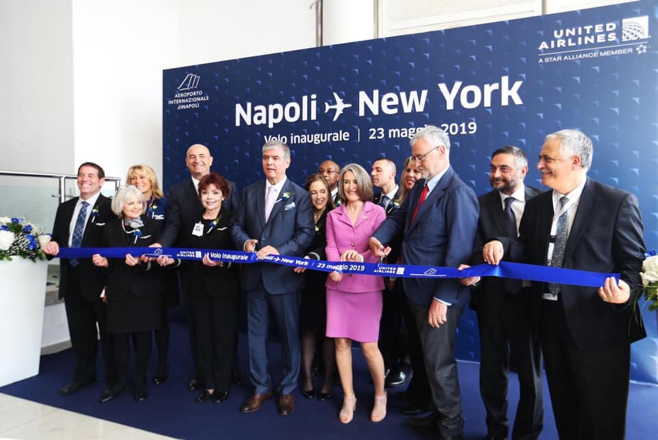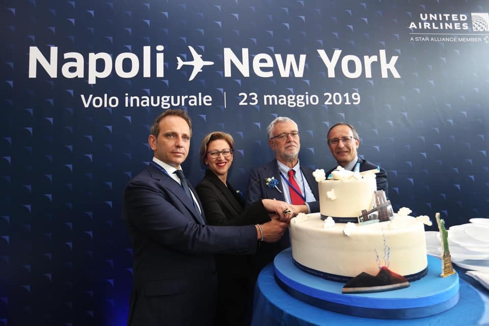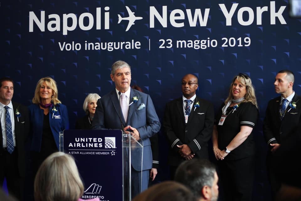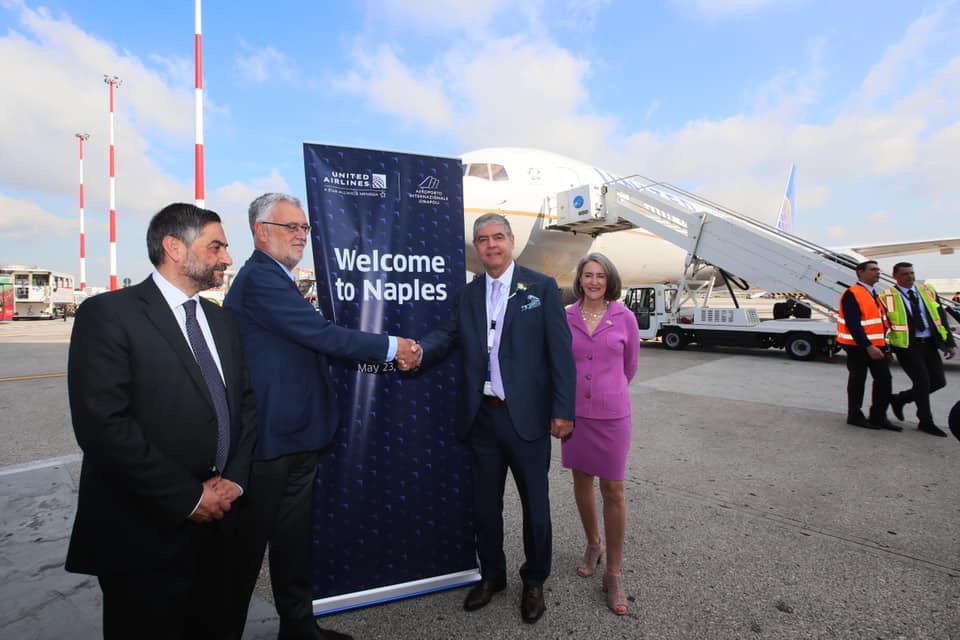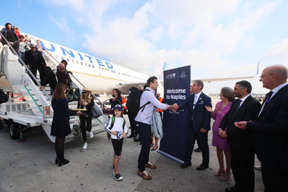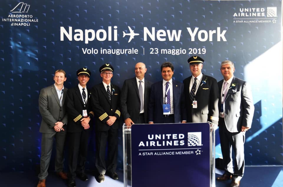 I piloti che salutano all’arrivo a Napoli del primo volo United Airlines da New York Newark.