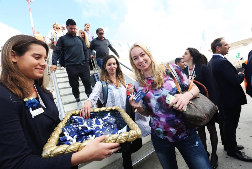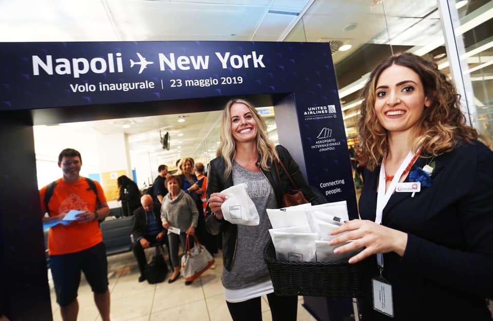 I gadget distribuiti ai primi passeggeri sbarcati nell’aeroporto partenopeo.
