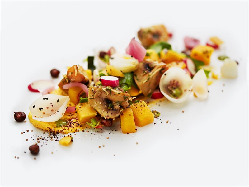 Uno dei due nuovi piatti è il cavolfiore tostato in olio di camelina con un’insalata di lenticchie Gotland, fagioli neri e insalate di barbabietola. L’altro piatto contiene funghi Hällestads conservati in aneto e rafano con una rutabaga, un pisello Slätte Gård, ravanello e Persula Gårds rape arrostite, insalata di colza.