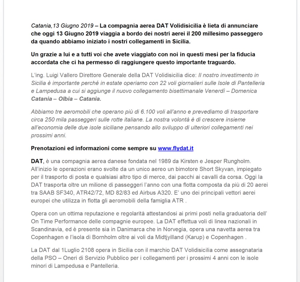 Nella nota stampa emessa da DAT – Volidisicilia c’e’ La notizia che il 13 giugnoe’ stato trasportato il passeggero numero 200mila.