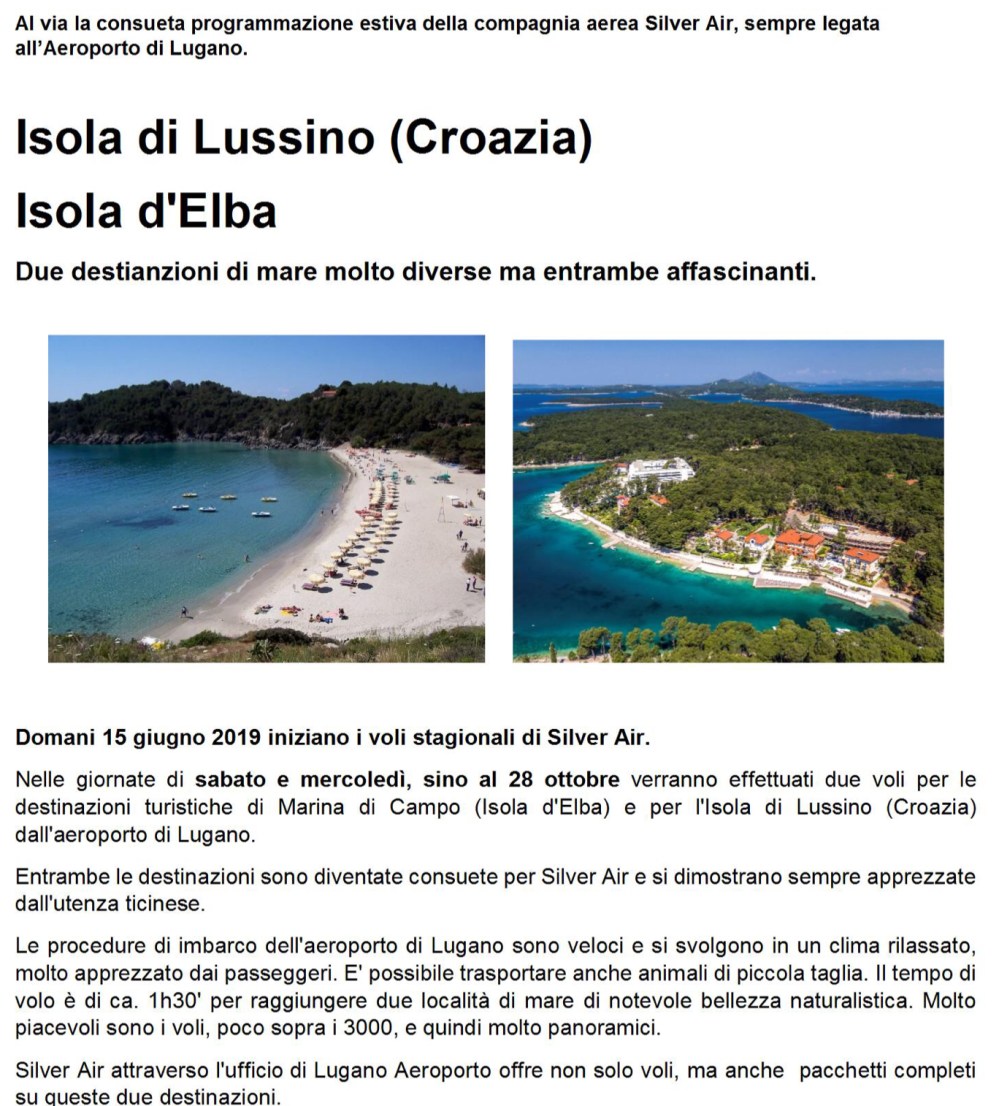 compagnie aeree, rotte Silver Air riprende i voli da Lugano per Lussino e l’isola d’Elba Pubblicato da Italiavola il 15 giugno 2019 Silver Air ha ripreso da oggi i voli tra le isole di Lussino e Elba per Lugano in Svizzera. Le due destinazioni balneari saranno raggiungibili con voli diretti bisettimanali il mercoledì ed il sabato. Tutti i voli sono operati con bimotori Let 410. Condividi: Fai clic per condividere su Facebook (Si apre in una nuova finestra) Facebook Fai clic qui per condividere su LinkedIn (Si apre in una nuova finestra) LinkedIn Fai clic qui per condividere su Reddit (Si apre in una nuova finestra) Reddit Fai clic qui per condividere su Pinterest (Si apre in una nuova finestra) Pinterest Fai clic qui per condividere su Tumblr (Si apre in una nuova finestra) Tumblr Fai clic per condividere su X (Si apre in una nuova finestra) X Mi piace Caricamento... Correlati