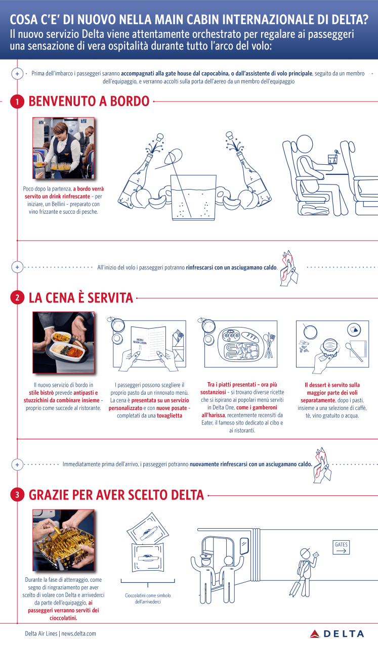 La nuova esperienza di bordo in Main Cabin sulle rotte internazionali fa parte dell’investimento multimiliardario della compagnia aerea nell’esperienza di viaggio complessiva del passeggero. Negli ultimi anni, il vettore ha apportato miglioramenti significativi al servizio in Main Cabin, introducendo pasti gratuiti sulle rotte coast-to-coast, messaggistica gratuita in volo, intrattenimento di bordo gratuito, nuovi snack, prosecco, accesso al Wi-Fi su quasi tutti i voli, e rinnovata varietà di prodotti Flight Fuel disponibili per l’acquisto. I recenti aggiornamenti dell’esperienza a bordo della classe Delta One includono la proposta di menù stagionali, creati da rinomati chef, con la possibilità di preselezionare il proprio pasto prima della partenza, un nuovo servizio da portata firmato Alessi e molto altro ancora.
