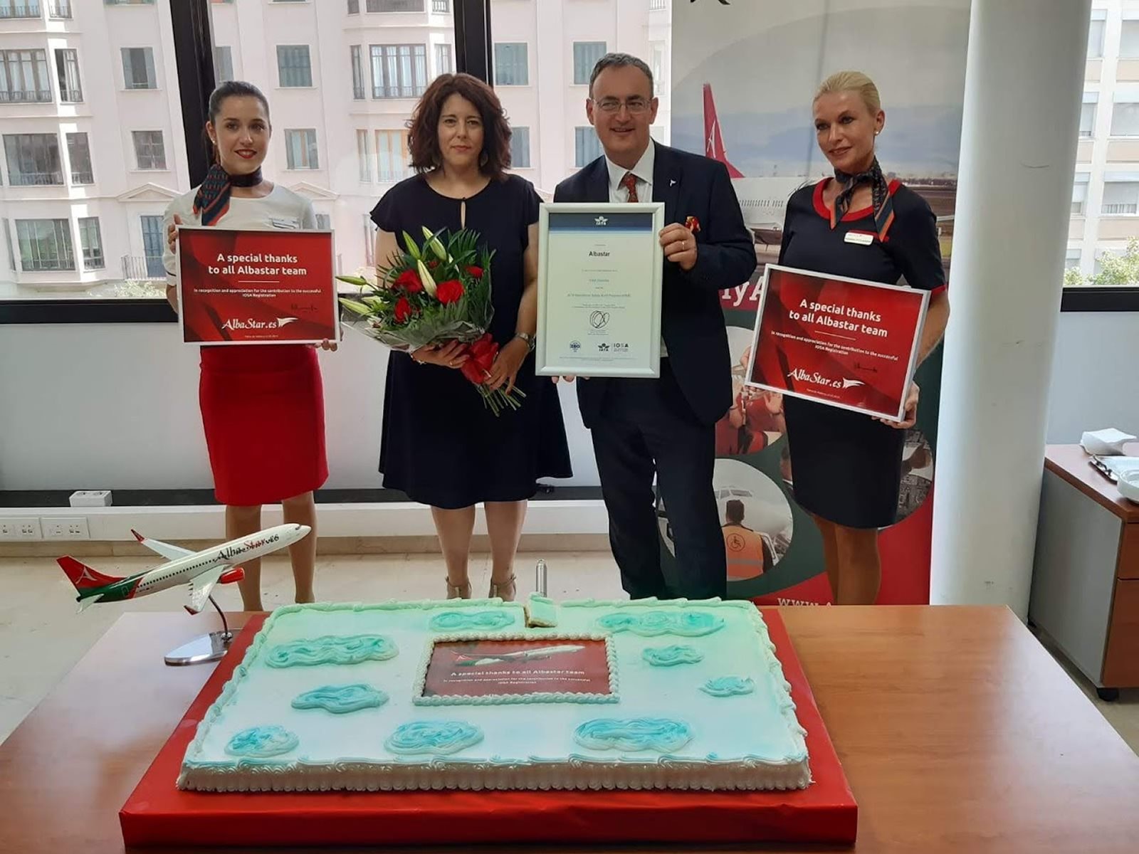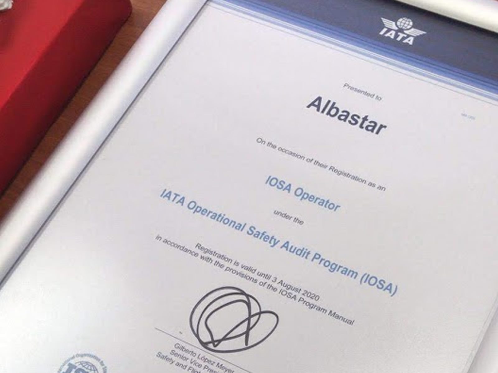 AlbaStar e’ stata certificata da IATA in armonia con la IOSA. E’un importante traguardo per il vettore, questo in termini tecnici e qualitativi. La certificazione raggiunta gli permette di avere ulteriore visibilità per lo standard raggiunto. Questo riconoscimento gli permetterà di essere utilizzata anche da altri vettori che nella IOSA riconoscono un vettore per allinearlo tra quelli che garantiscono una affidabilità operativa per le eventuali proprie temporanee necessità.