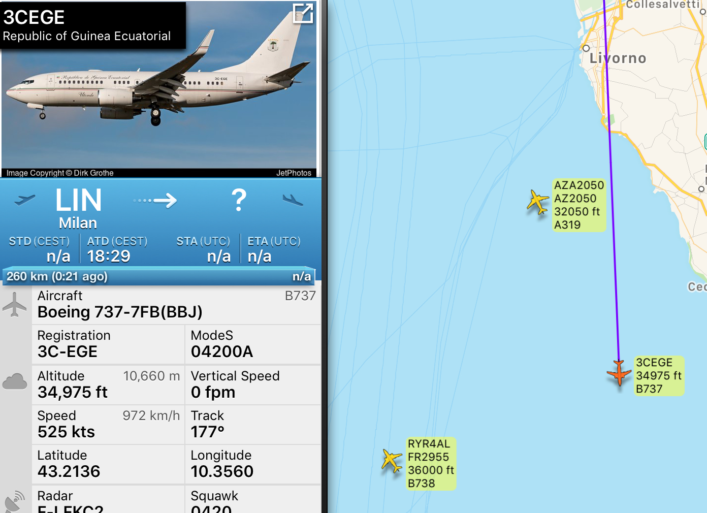 compagnie aeree Il B737/700VIP della Repubblica della Guinea Equatoriale partito da Linate Pubblicato da Italiavola il 11 luglio 2019 E’ da poco decollato da Milano Linate l’aereo governativo B737-7FB BBJ 3C-EGE della Repubblica della Guinea Equatoriale. Ora sta navigando a FL350 sul Mar Tirreno verso sud. Condividi: Fai clic per condividere su Facebook (Si apre in una nuova finestra) Facebook Fai clic qui per condividere su LinkedIn (Si apre in una nuova finestra) LinkedIn Fai clic qui per condividere su Reddit (Si apre in una nuova finestra) Reddit Fai clic qui per condividere su Pinterest (Si apre in una nuova finestra) Pinterest Fai clic qui per condividere su Tumblr (Si apre in una nuova finestra) Tumblr Fai clic per condividere su X (Si apre in una nuova finestra) X Mi piace Caricamento... Correlati