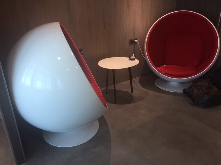 Due iconiche Ball Chairs, identiche a quelle disegnate da Eero Aarnio sono arrivate alla nuova rinnovata Lounge di Air France a Lione.