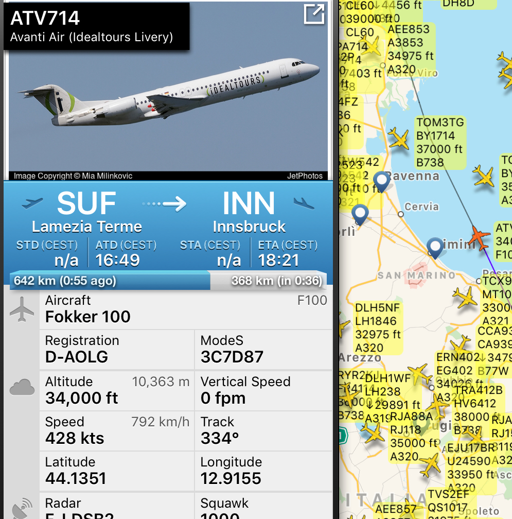 Questo F100 della Avanti Air con marche D-AOLG sta volando tra Lamezia ed Innsbruck.