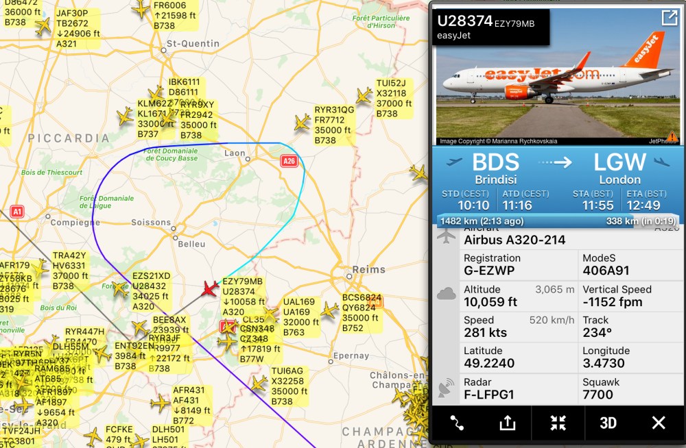 Ad est di Parigi pochi minuti fa il volo Brindisi – Londra Gatwick di easyJet ha inserito 7700 sul transponder dichiarando emergenza. Non conosciamo la tipologia, ma ha invertito a destra ed e’ sceso immediatamente di quota. Il volo e’ la U2 8374 con A320-200 G-EZWP.
