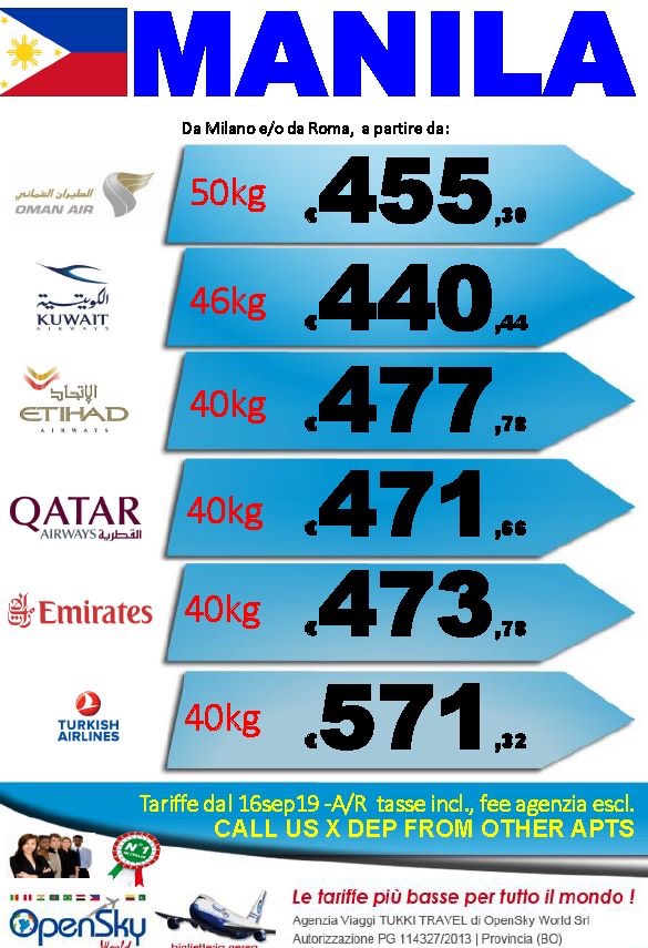 compagnie aeree, rotte, vola e paga poco Manila : voli per passeggeri etnici Pubblicato da Italiavola il 10 agosto 2019 Qui OpenSky World propone tariffe etniche per chi si deve recare a Manila dall’Italia. prezzi da 440€ e bagagli da 40 a 50 kg a seconda dei vettori. Condividi: Fai clic per condividere su Facebook (Si apre in una nuova finestra) Facebook Fai clic qui per condividere su LinkedIn (Si apre in una nuova finestra) LinkedIn Fai clic qui per condividere su Reddit (Si apre in una nuova finestra) Reddit Fai clic qui per condividere su Pinterest (Si apre in una nuova finestra) Pinterest Fai clic qui per condividere su Tumblr (Si apre in una nuova finestra) Tumblr Fai clic per condividere su X (Si apre in una nuova finestra) X Mi piace Caricamento... Correlati