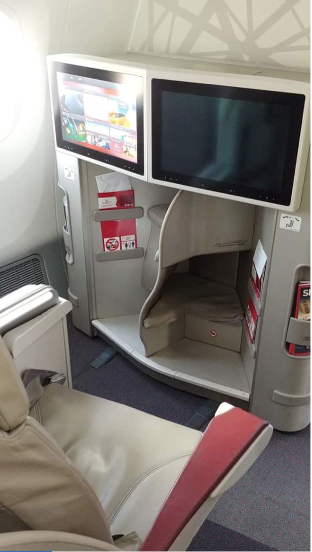Come si vede le sedute della Execuye Class sono spaziose, accoppiate, ma con angolazione diversa. Totalmente lie flat, cioè con piano di riposo completamente reclinato. Grandi monitor per visionare l’IFE.
