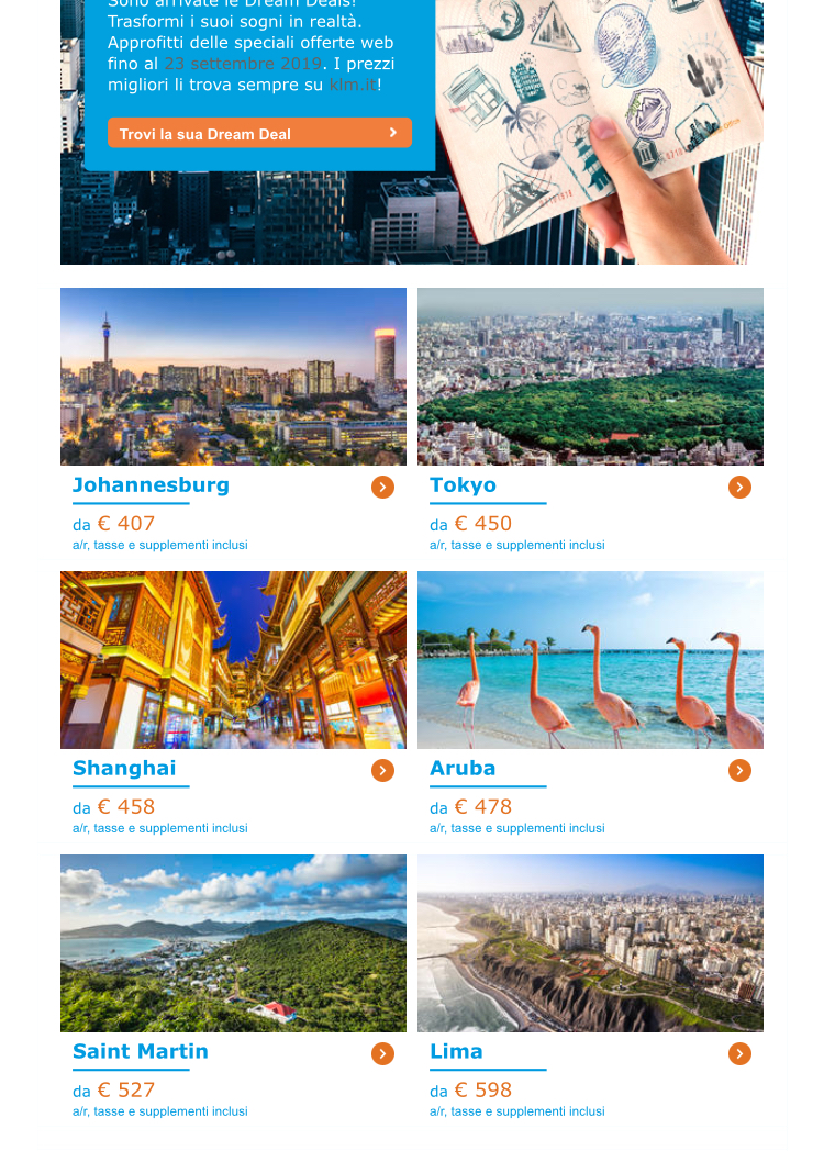 • I prezzi pubblicizzati sono soggetti a modifiche senza preavviso, prima della conferma della prenotazione. La preghiamo di controllare i prezzi esatti e le condizioni applicabili per le date e i voli da lei scelti al momento della prenotazione su KLM.com.