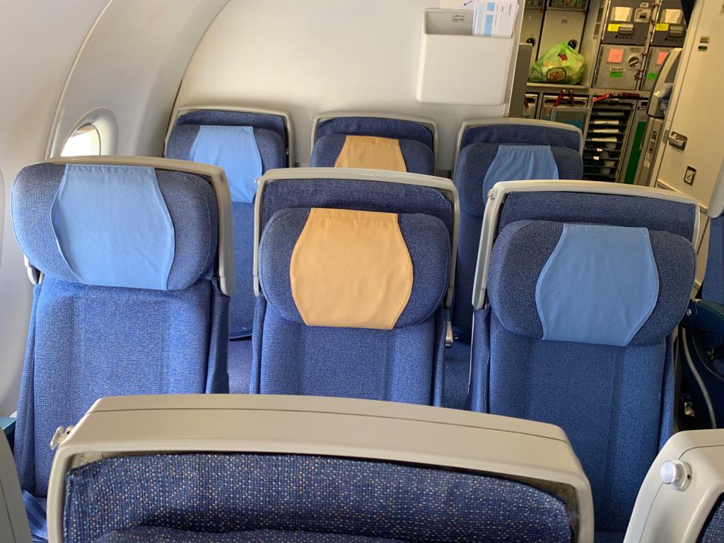 Due compartimenti e due sistemazioni interne. 2-2 in business Class e 3-3 in economica. Tinta unita blu per i tessuti delle sedute. Il monitor in ogni singolo posto. Il pitch in economica con un buon comfort generale per le gambe.