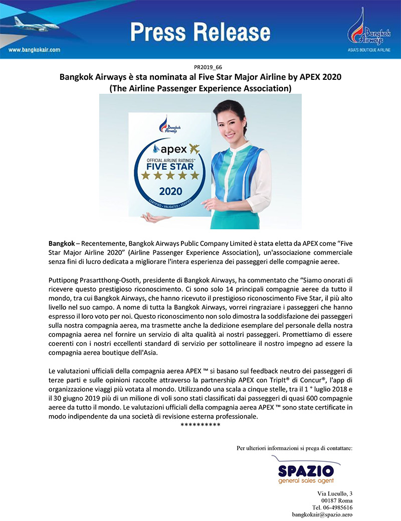 Bangkok Airways vince all’APEX 2020. E’ Five Star Major Airline