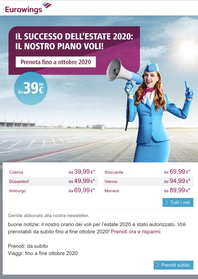 compagnie aeree, rotte, vola e paga poco Eurowings : e’ disponibile tutta l’estate 2020 Pubblicato da Italiavola il 30 ottobre 2019 Tutta l’estate 2020 di Eurowings e’ prenotabile da ora. Tante offerte e buoni prezzi per le rotte secondarie tra Italia e Germania. Condividi: Fai clic per condividere su Facebook (Si apre in una nuova finestra) Facebook Fai clic qui per condividere su LinkedIn (Si apre in una nuova finestra) LinkedIn Fai clic qui per condividere su Reddit (Si apre in una nuova finestra) Reddit Fai clic qui per condividere su Pinterest (Si apre in una nuova finestra) Pinterest Fai clic qui per condividere su Tumblr (Si apre in una nuova finestra) Tumblr Fai clic per condividere su X (Si apre in una nuova finestra) X Mi piace Caricamento... Correlati