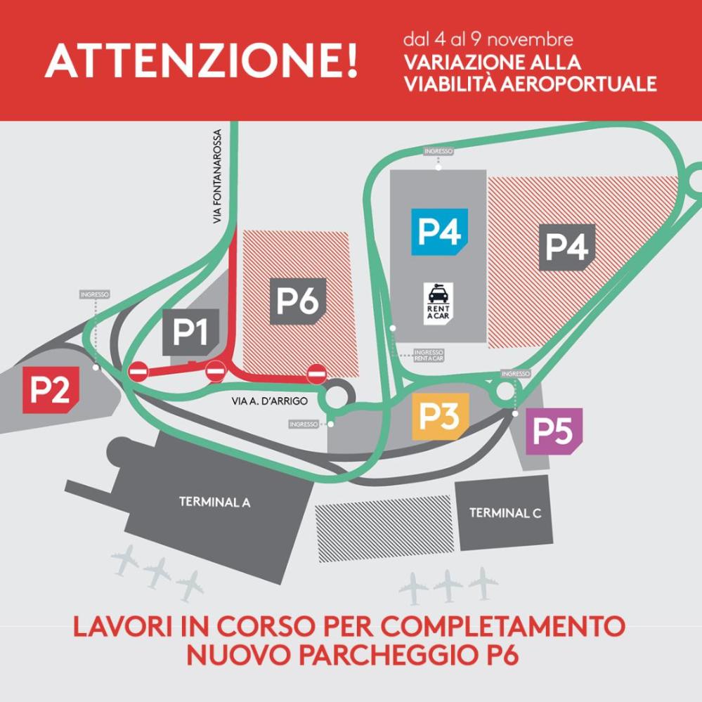 Dal lunedì 11 novembre a giovedì 5 dicembrei lavori interesseranno l’area centrale del sedime aeroportuale, e comporteranno la chiusura della via Angelo D’Arrigoe la conseguente chiusura del parcheggio P3(a sosta breve e lunga).