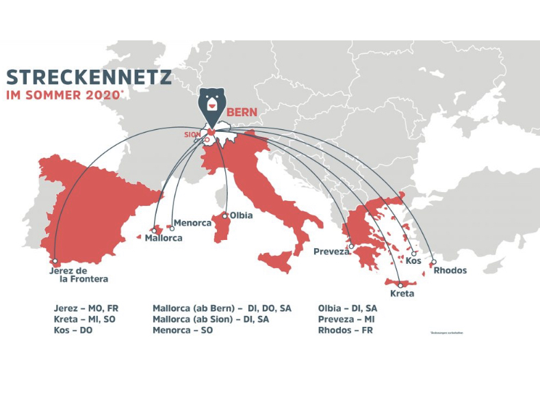 L’intenzione e’ volare dalla capitale Svizzera verso un network per il momento nel periodo iniziale solamente leisure. Jerez de la Frontera, Palma de Maiorca (anche da Sion), Menorca in Spagna, Olbia in Italia, Preveza, Kos, Creta e Rodi in Grecia.
