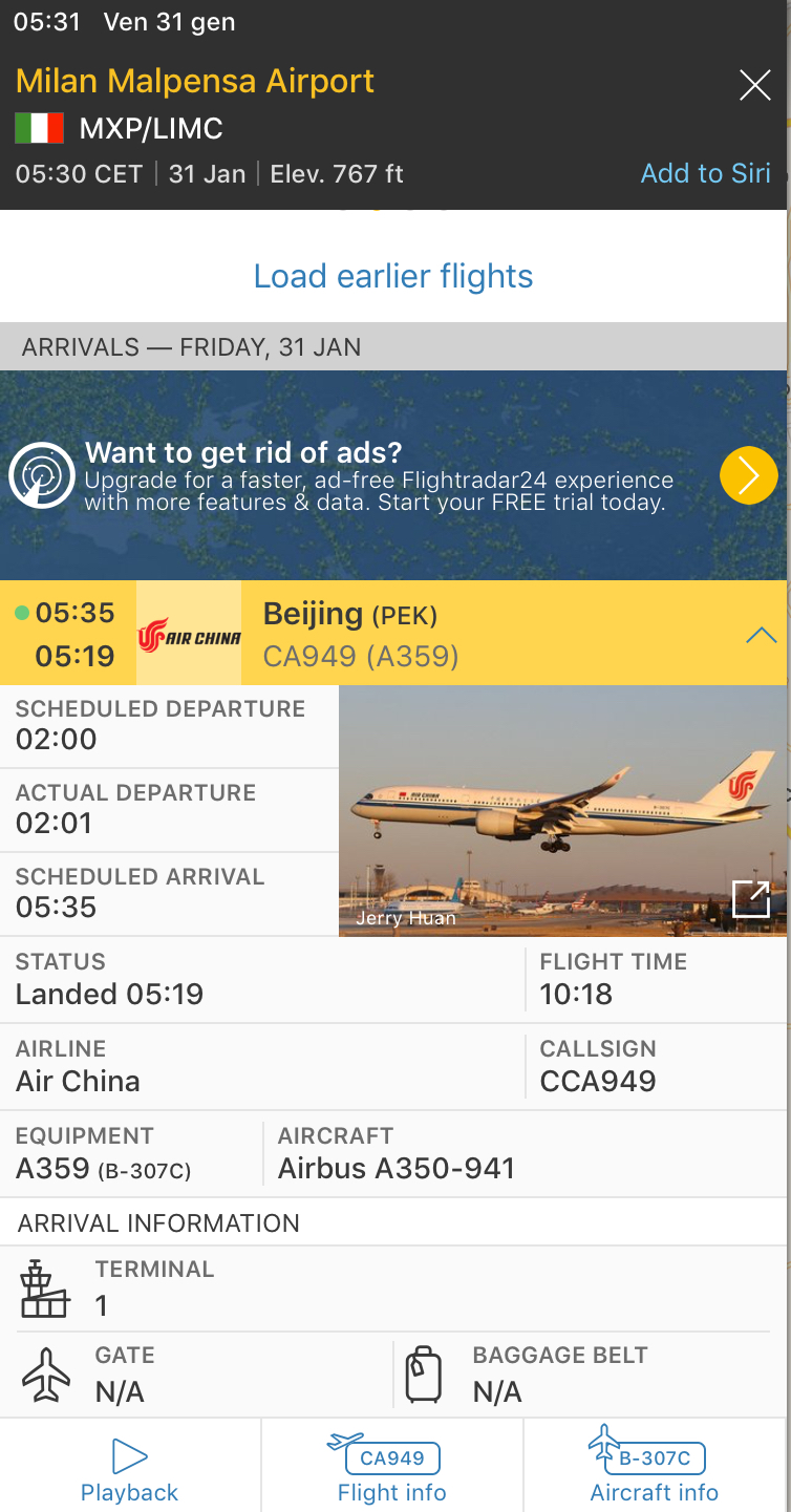 Nonostante la volontà di bloccare i voli provenienti dalla Cina, questa mattina il primo di cinque voli e’ regolarmente atterrato, in arrivo dal paese asiatico. E’ la Air China CA949 da Pechino per Milano Malpensa. Quello nella foto.