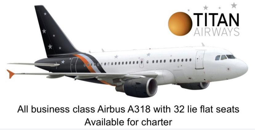 Titan Airways ora ha disponibile un velivolo A318-100 con configurazione corporate VIP a 32 posti lie flat. Il pitch e’ di 72 pollici e la poltrona in assetto piano orizzontale e’ per persone alte oltre 6 piedi.