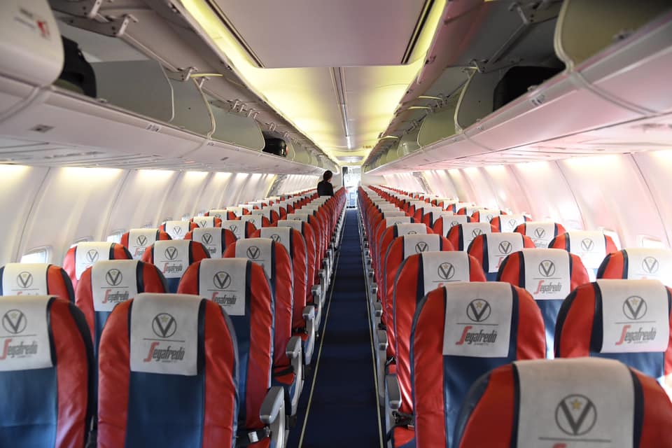 L’aereo ha le salviette poggiatesta completamente brandizzate Virtus Segafedo.