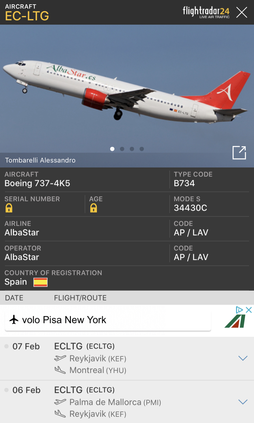 compagnie aeree, rotte AlbaStar : vola a a Montreal un B737/400 Pubblicato da Italiavola il 9 febbraio 2020 Ha volato con le marche il B737/4Q8 EC-LTG Albastar in ritorno al lessor tra mercoledì e giovedì sulla Palma de Maiorca – Keflavik e poi Montreal. Condividi: Fai clic per condividere su Facebook (Si apre in una nuova finestra) Facebook Fai clic qui per condividere su LinkedIn (Si apre in una nuova finestra) LinkedIn Fai clic qui per condividere su Reddit (Si apre in una nuova finestra) Reddit Fai clic qui per condividere su Pinterest (Si apre in una nuova finestra) Pinterest Fai clic qui per condividere su Tumblr (Si apre in una nuova finestra) Tumblr Fai clic per condividere su X (Si apre in una nuova finestra) X Mi piace Caricamento... Correlati