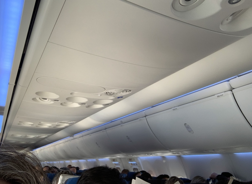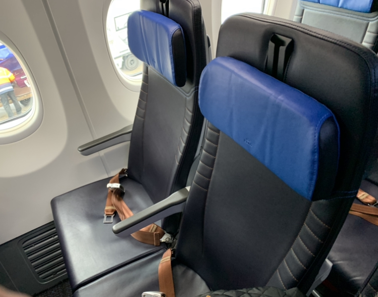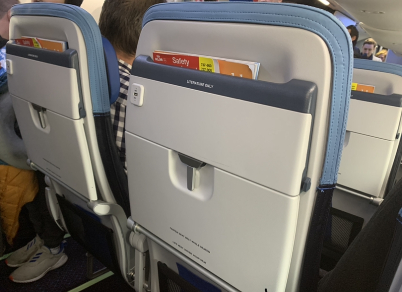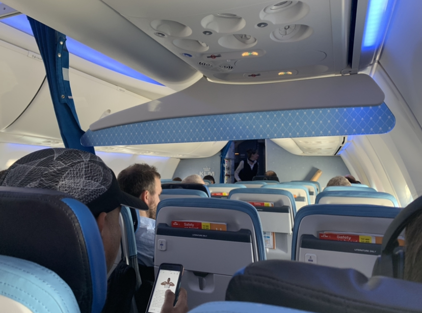 Curioso il disegno dei tulipani sul divisorio tra business class ed economy class. Il lay out Sky Interiors regalano più spazio e vivibilità come impressione per i passeggeri. Le cappelliere permettono di ruotare i trolley verticalmente, anziché orizzontalmente come negli altri B737 in dotazione al vettore olandese. L’illuminazione e’ variabilmente e completamente a LED. I finestrini sono medesimi, ma i pannelli ridisegnati gli danno un che di più moderno.
