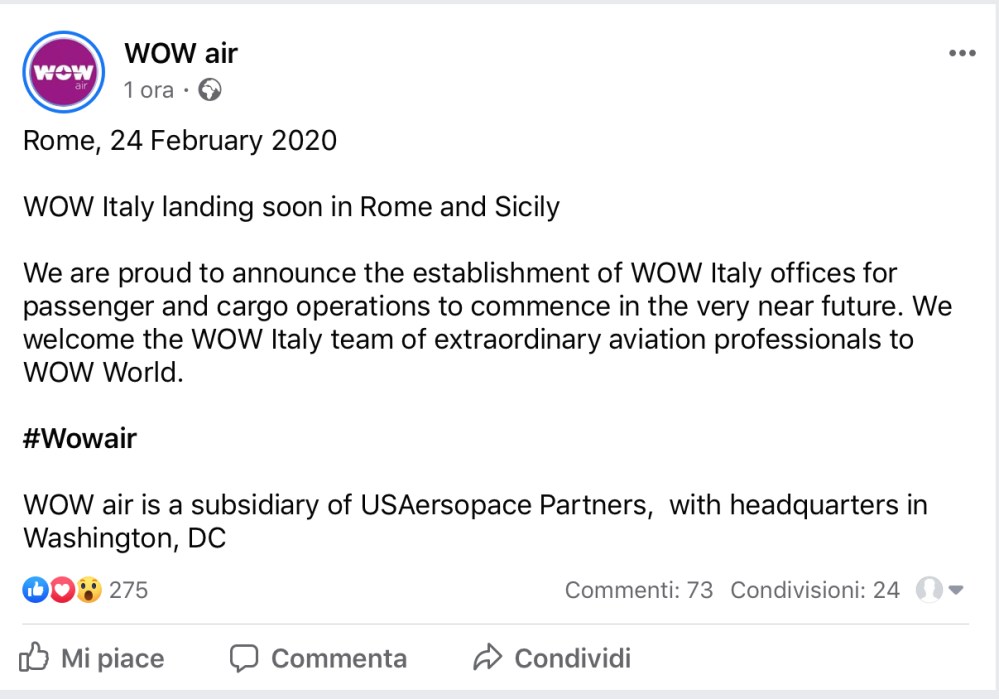 Che cosa ci sarà di nuovo su questo post apparso un ora fa sulla pagina di #WOWAir. Sembra che ci sarà una #WOWItaly. Nel testo in inglese vi e’ la notizia dell’apertura di uffici in Italia per operazioni passeggeri e cargo che inizieranno nel prossimo futuro.