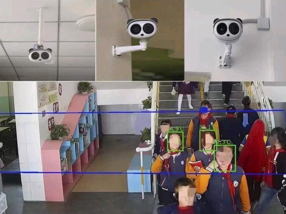 I due occhi, sono esattamente con funzioni diverse. Il primo e’ una telecamera che riprende e produce sequenze di fotogrammi, ognuno ogni 30 ms. Poi interfacciata a quella termica, che rileva la temperatura della fronte ed e’ in grado di scoprire chi e’ oggetto di alterazione con un errore di scarto molto basso.