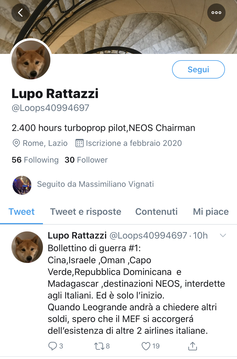 Lo sfogo con un tweet di Lupo Rattazzi – Presidente Neos – su quello che la sobria e solida compagnia aerea italiana in pochi giorni ha visto momentaneamente crollare molte sue vie di business.