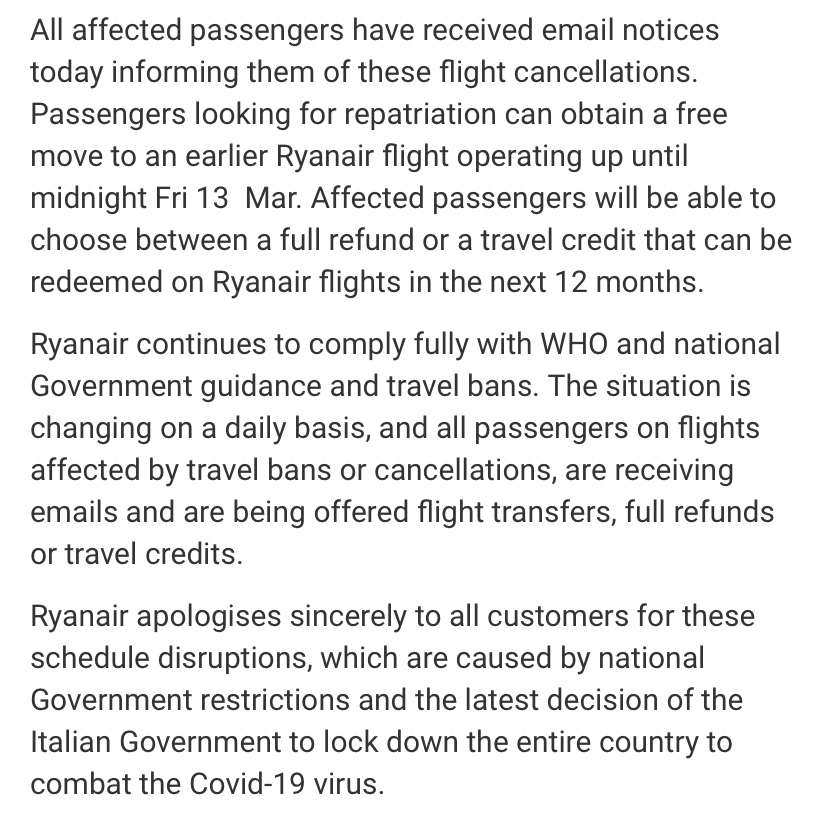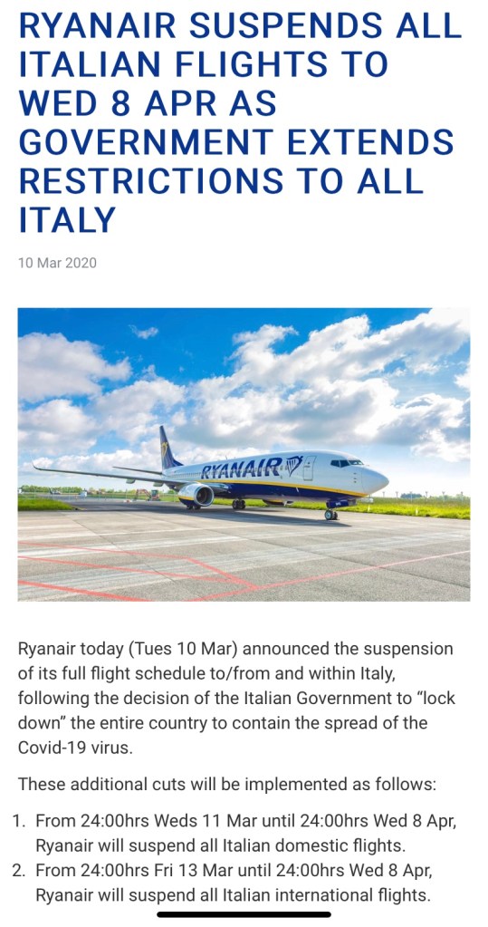 Il lock down deciso dal Governo Italiano ha fatto prendere questa decisione al vettore irlandese.
