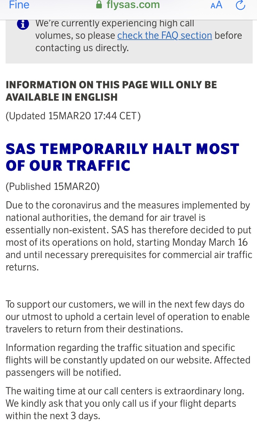 SAS riduce pesantemente il suo operativo a causa delle restrizioni imposte dai Governi danese e norvegese.