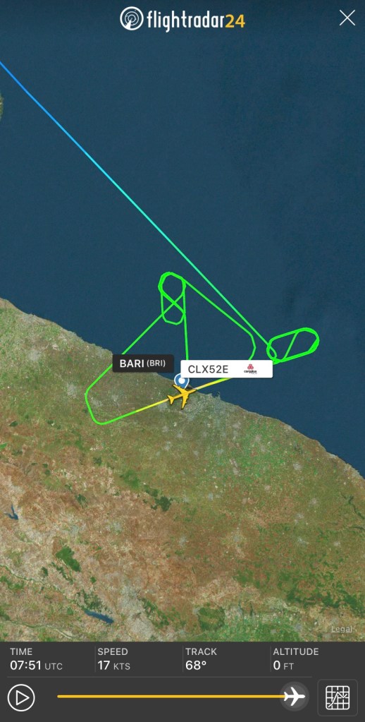 Questa mattina un Boeing 747-4R7F LX-YCV della Cargolux e’ partito da Lussemburgo per un volo di riposizionamento su Bari. A causa della bassa visibilità causa nebbia e copertura altrettanto bassa ha effettuato due avvicinamenti per 25 senza completarlo poi uno per 07, nonché holding in due punti. Il primo avvicinamento e’ stato alle 07:04 e quindi il successivo alle 07:20, quindi una breve holding. Per pista 25 alle 07:45 circa, a seguire asse pista per mettersi in holding per un ora ad est dello scalo sull’asse pista a 3725ft. Quindi l’avvicinamento e atterraggio avvenuto alle 08:49.