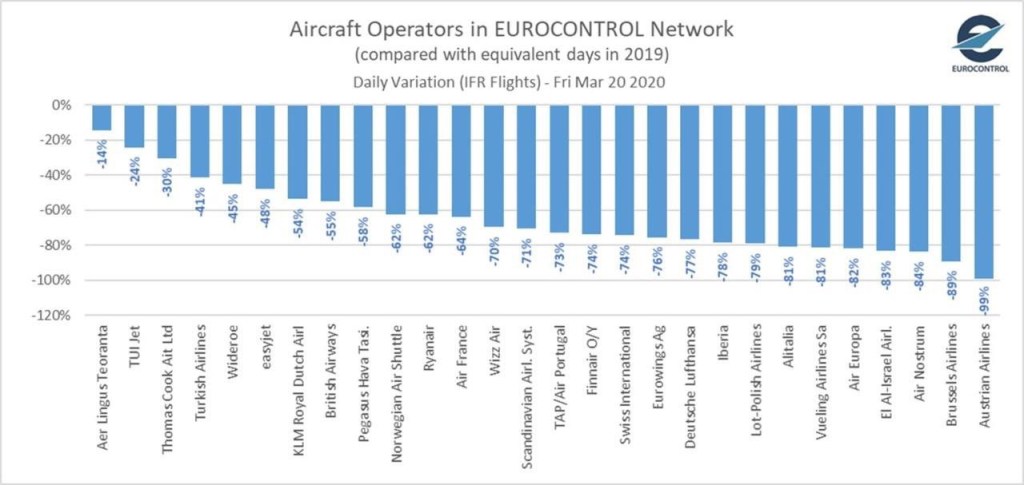 Sempre più male, questo ogni giorno che passa. Da questo grafico di Eurocontrol riferito a ieri, si compara con l’anno precedente il differenziale percentuale su quanti movimenti in meno hanno operato i grossi vettori europei. Una debacle, che cresce sempre più.